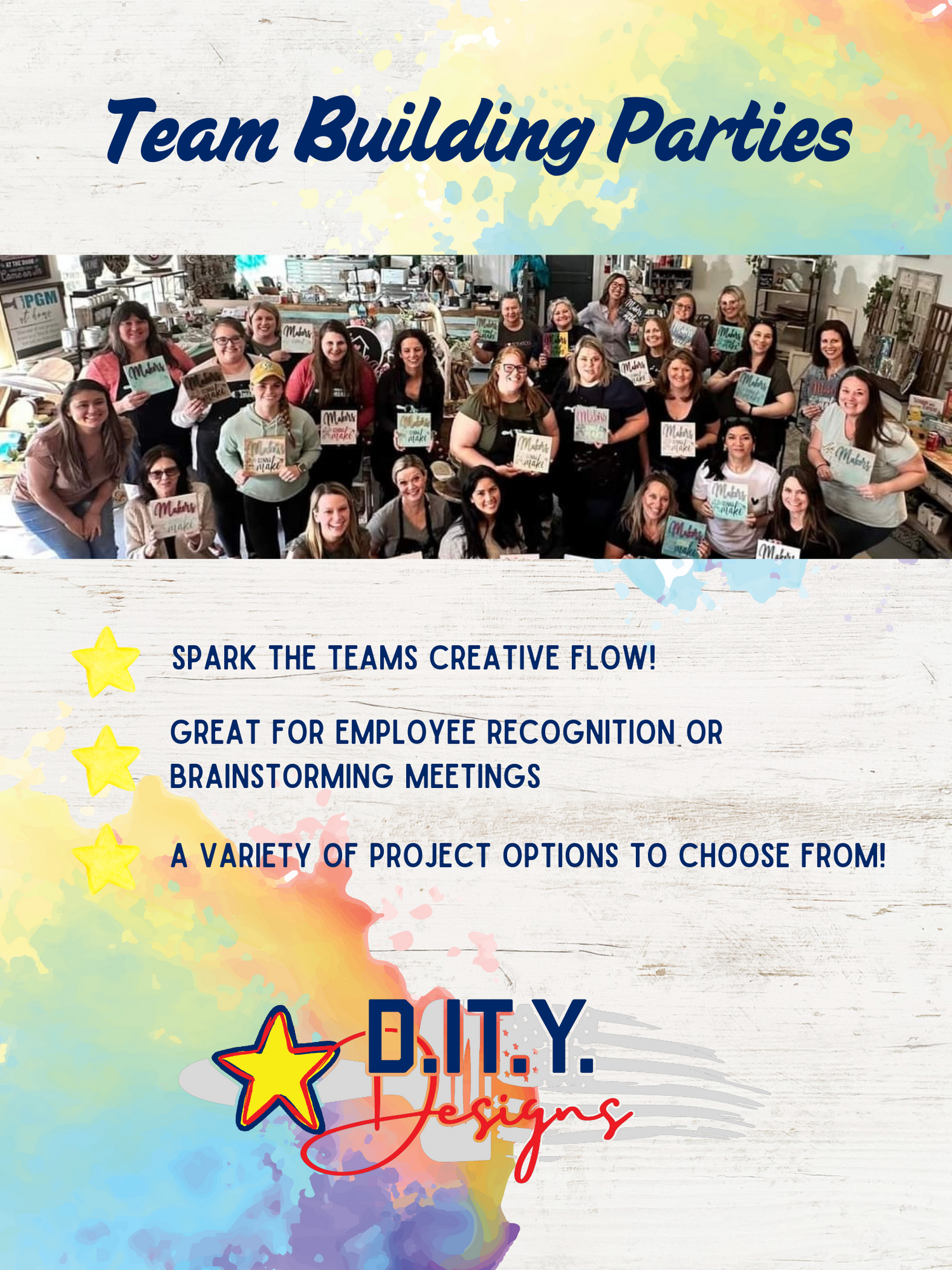 Get into creativity with our Pick Your Project workshops or get messy with paint pouring! Our Team Building Workshops are the perfect excuse to rally your crew and bust out of those comfort zones! Our fabulous party coordinator will whip up registration options that fit your needs and budget like a glove. It’s the ultimate way to reward your hardworking team or spark some brainstorming magic!